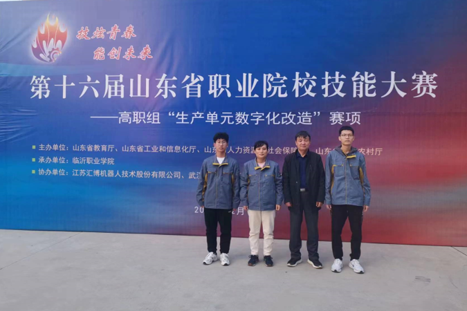12月12日,第十六届山东省职业院校技能大赛高职组“生产单元数字化改造”(师生同赛)赛项在临沂职业学院圆满落幕,全省30支代表队参加。经过激烈角逐,我院机电工程系王守顺、段宏钢两位教师参与指导,由教师徐秀秀与工业机器人技术专业学生赵建、机电一体化技术专业中德智能制造班学生刘玉杰组成的参赛队,荣获一等奖。
