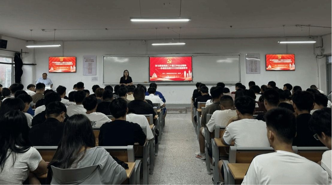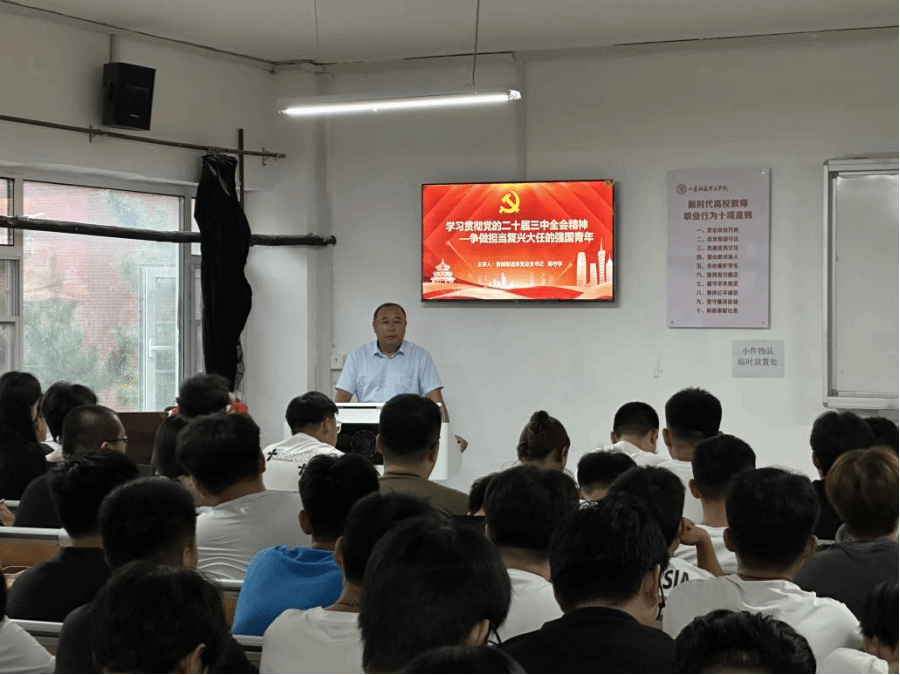 2024年8月25日晚上,必威西汉姆联官网首页组织在博学楼A207开展“开学第一课”活动,活动主题是“学习贯彻党的二十届三中全会精神——争做担当复兴大任的强国青年”。本次活动由必威西汉姆联官网首页党总支书记陈守学主讲,党总支副书记主持会议,全体辅导员,团学干部和入党积极分子等学生代表参加。