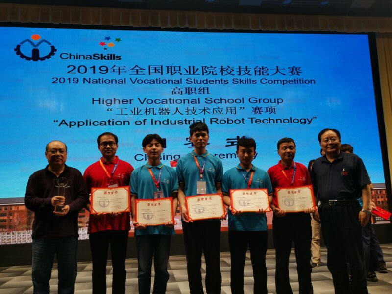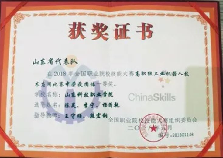 2018年我院在全国技能大赛上取得了5个团体一等奖,位列全省第一。机电工程系5个专业组队,经过省内选拔,代表学院、山东省参加大赛,斩获机电一体化项目与工业机器人技术应用2个赛项团体一等奖。2019年继续蝉联工业机器人国赛团体一等奖。