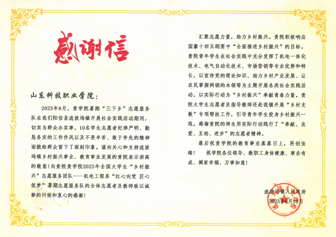 我院机电工程系“红心向党 匠心筑梦”暑期志愿服务团队成功入选2023年全国大学生“乡村振兴”志愿服务团队。8月5日起,志愿服务团队赴阳信县流坡坞镇开展为期10天的暑期社会实践活动,期间志愿者们纪律严明,切实为群众办实事。阳信县流坡坞镇人民政府向我院发来感谢信,向学院领导、全体教职工及全体学生志愿者致以诚挚的问候和衷心的感谢!